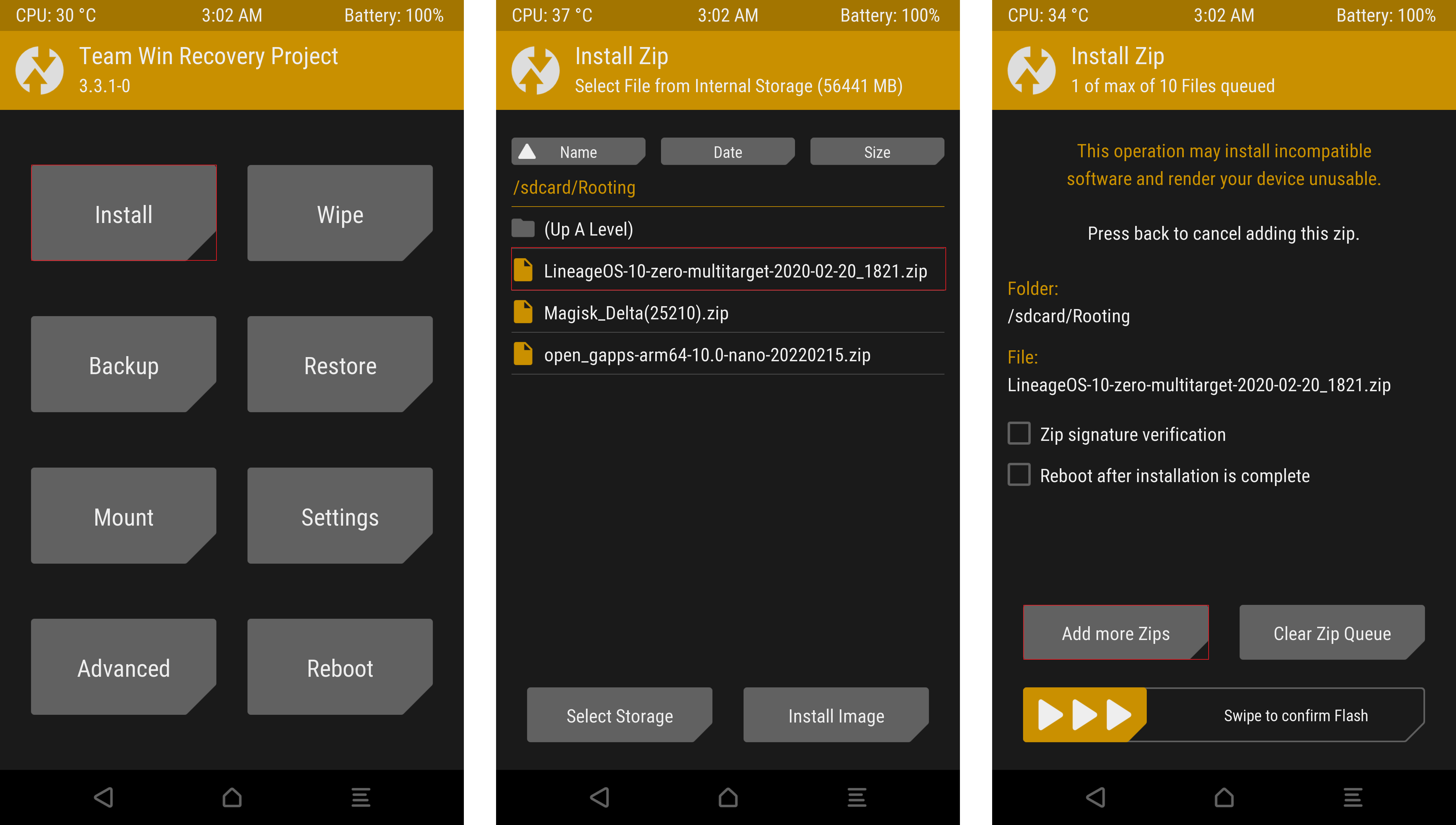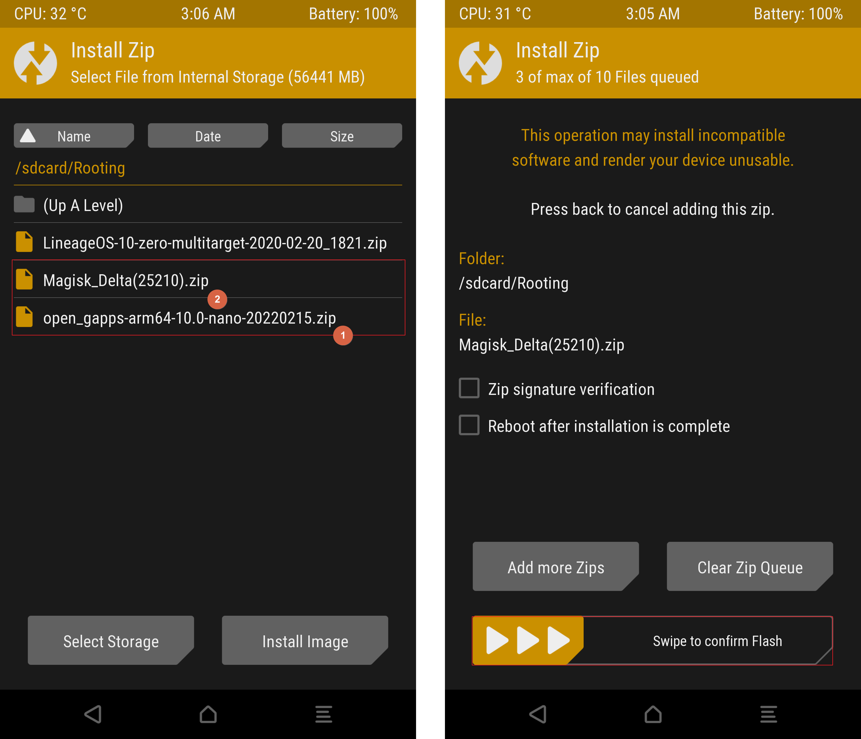 이후 화면 단 내 "Install" 메뉴에 접근하여 커스텀 펌웨어 파일을 선택, 펌웨어 설치 이후 추가 파일 설치 진행을 위해 'Add more Zips' 기능으로 Gapps 파일 선택 후 'Swipe to confirm Flash' 로 파일 설치를 진행한다.