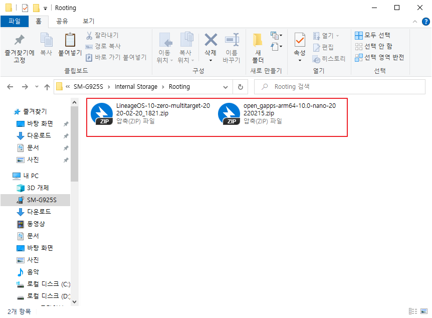 Wipe 완료 이후 해당 디바이스를 PC와 연결하고 미리 다운받아 준비했던 커스텀 펌웨어 파일 과 Gapps 파일을 디바이스 내 복사해준다.