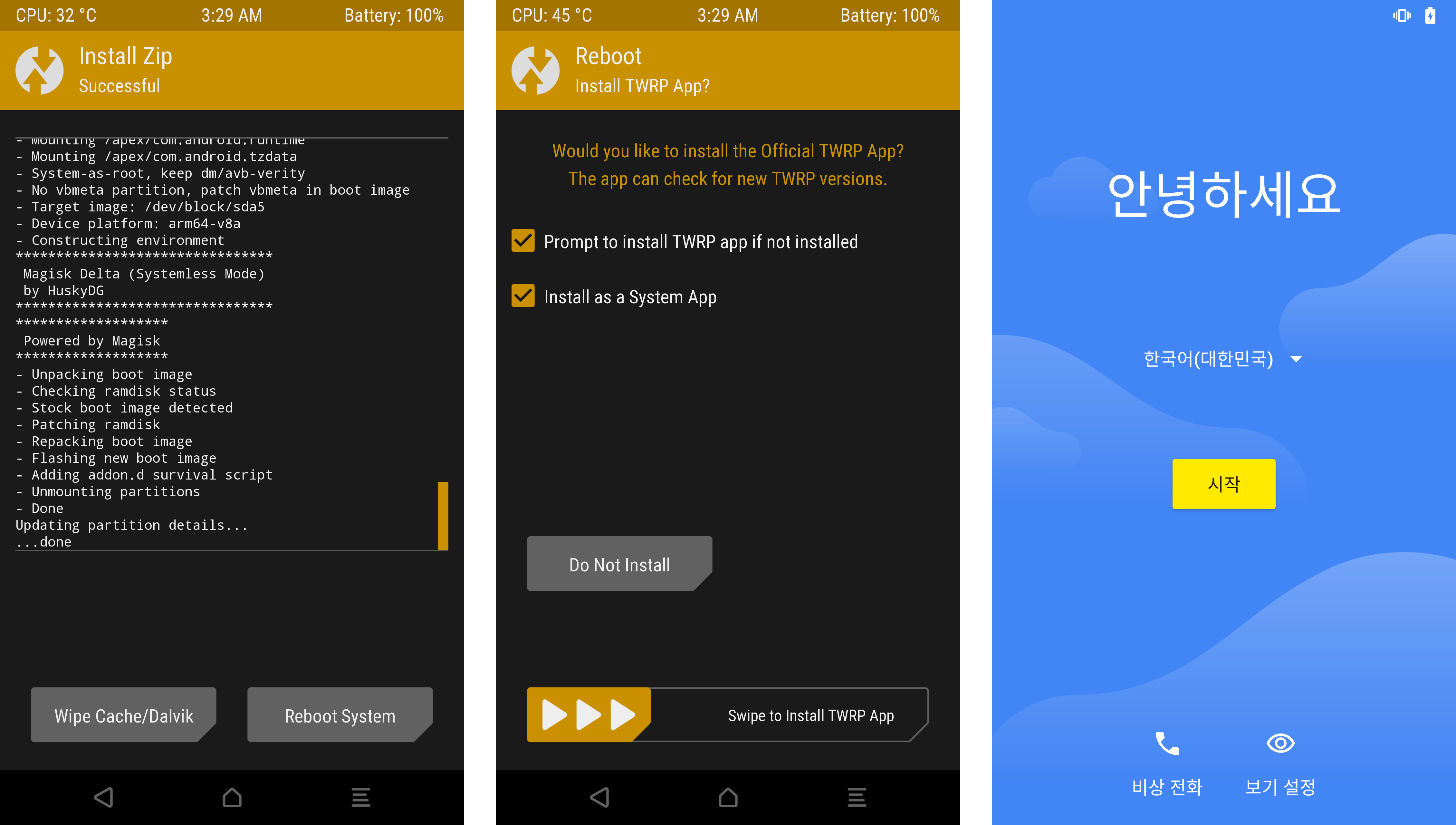 ※ 재부팅 진행 시 TWRP Recovery 앱을 설치할 거냐고 물어보는데 이때 본인의 입맛에 맞게 설치 여부를 결정하면 된다. 본인은 설치하기 귀찮아서 Do Not Install 로 설치 안했다.