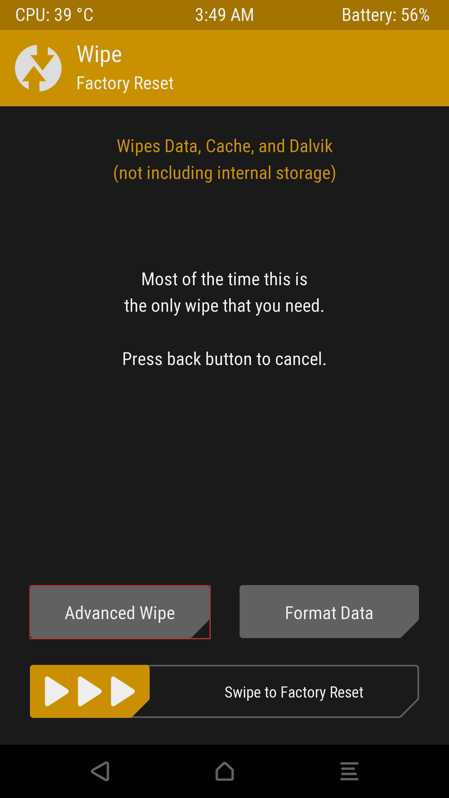 설치 이후 TWRP 메뉴에서 WIPE 메뉴에 접근, 임시 파일인 Dalvik Cache 와 ART Cache, Cache 파일 Wipe 이후 재부팅을 수행한다.