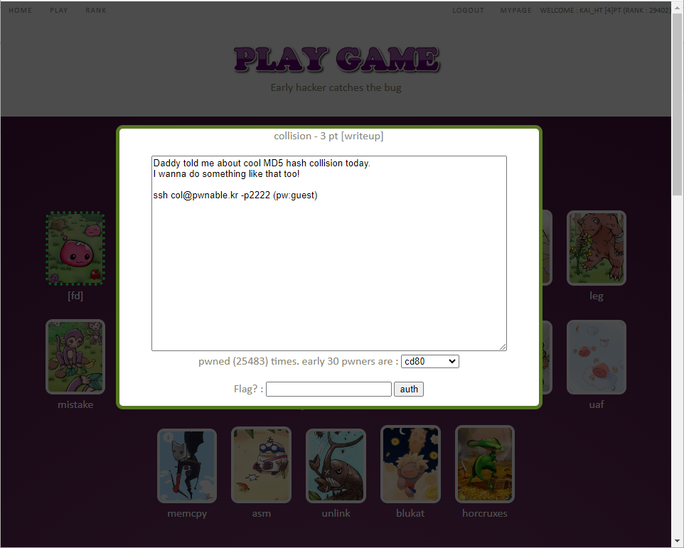 단어의 뜻은 '충돌' 이라는 뜻으로 문제 내용을 미루어볼 때, 쿨-한 MD5 해시가 충돌이났고, 그것과 연관된 문제라고 추측해보았다.