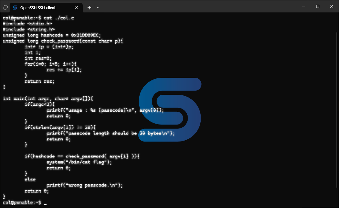 해당 문제에서 확인 가능한 파일은 총 3개로 col, col.c, flag 파일이다. 이전 문제와 마찬가지로 flag 파일에 대한 실행은 권한 문제로 인하여 해당 파일 내 값에 대한 확인이 불가하다.
