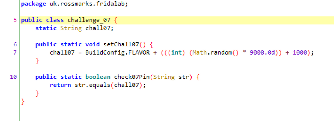 var challenge_07 = Java.use('uk.rossmarks.fridalab.challenge_07')