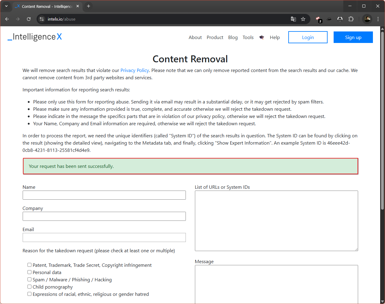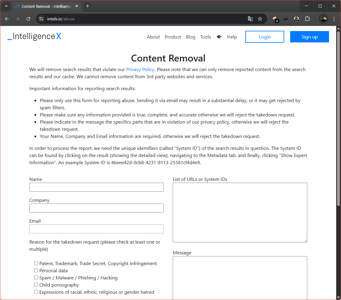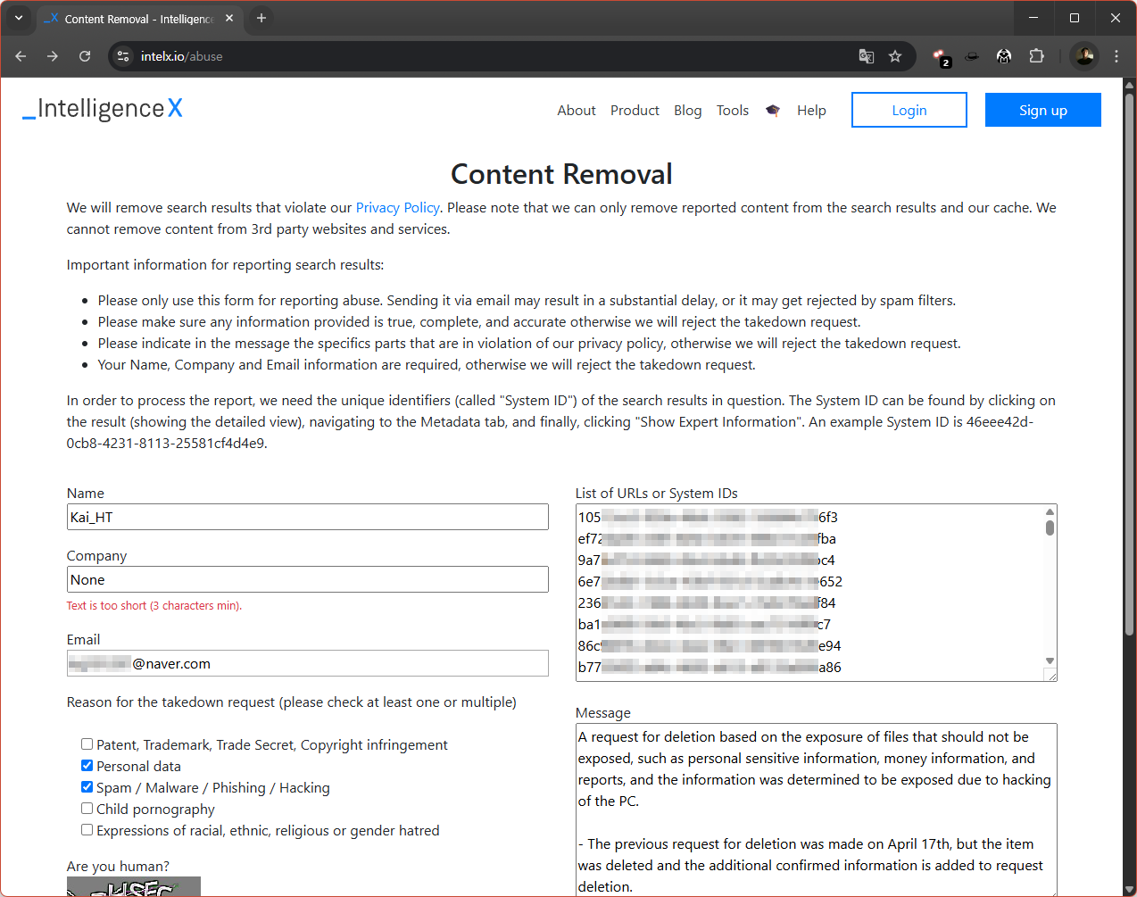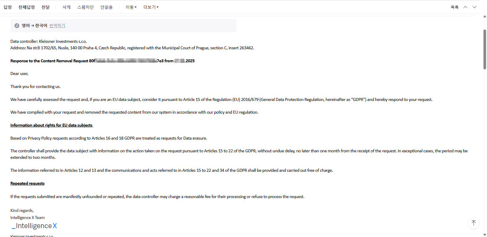 Intelligence X 에서 확인된 데이터들에 대한 삭제 요청이 가능한데, 이때 검색으로 도출되는 Name, Company, Email 을 검색한 값 대로 작성하여 요청해야 삭제를 해주는 대다가, 검색으로 도출된 정보들에 대한 세부정보 확인이 IP당 30건으로 제한되어 있어 모든 컨텐츠에 대한 삭제 요청이 힘들다.