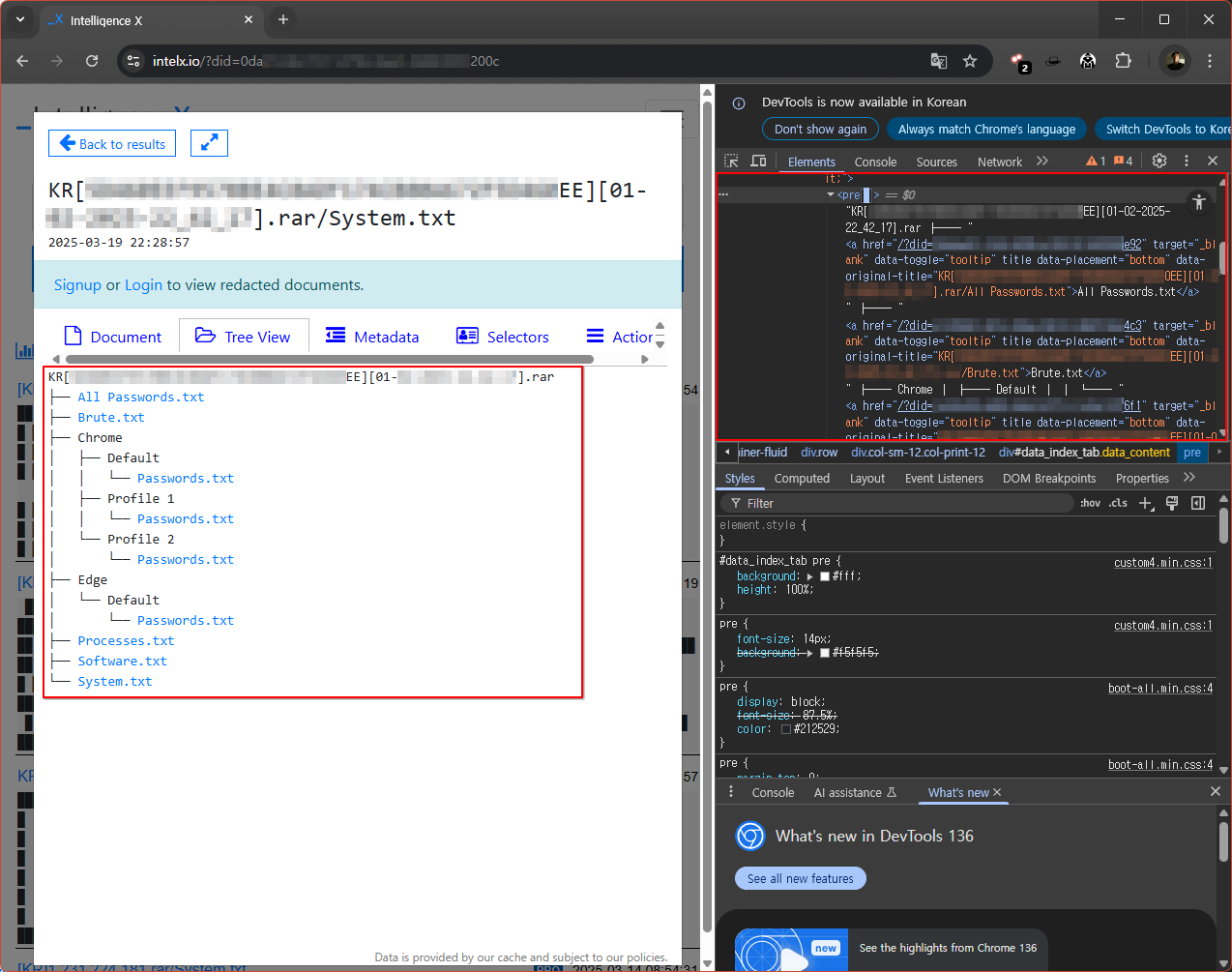 - Intelligence X 내 접속 후, 임의 문자열 검색을 수행
