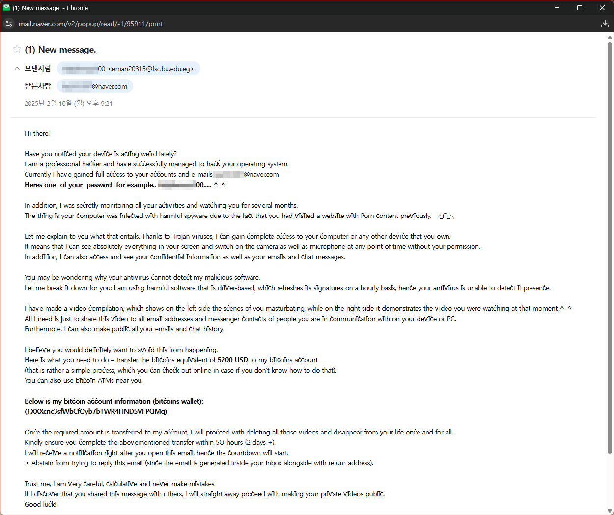 해당 메일 내용을 보면 알겠지만, 노출된 본인 이메일 정보로 해커가 비밀번호를 찾았다며 돈을 내놓지 않으면 PC의 WebCam 으로 녹화된 개인 시간을 보내고 있는 영상을 뿌리겠다고 협박하고 있다. 본인 PC의 경우 모니터 중 1대에 카메라가 존재하여 헉 했을 지도 모른다.