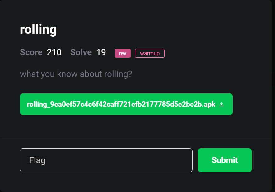 해당 문제는 Reversing 문제로 출제되었다. 문제 내 첨부된 첨부파일은 apk 파일 형식으로 배포되었으며, 안드로이드 분석 파일이라는 것을 추측할 수 있다.