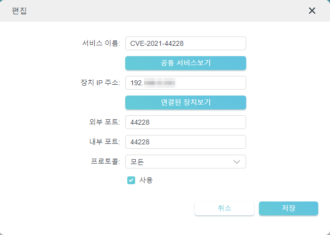 ※ 로컬이 아닌 외부에서 테스팅을 하는 경우 외부포트-내부포트 포워딩을 따로 해줘야한다. (당연한 사실이겠지만...)