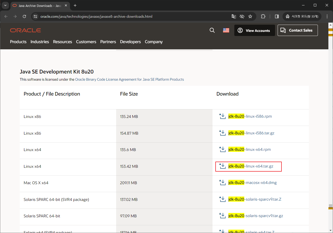 해당 자바 버전은 8u20 이며, 공식 홈페이지에서 로그인 후 다운로드 받아 사용하면 된다.
