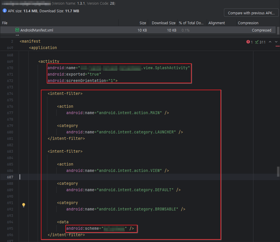 대상 앱을 디컴파일 해보거나 앱 패키지 내 AndroidManifext.xml 파일을 확인해보면 Exported 값이 true 로 설정된 Activity 를 확인이 가능하며, 사용가능한 intent 들과 딥링크 (URI) 정보에 대한 확인이 가능하다.