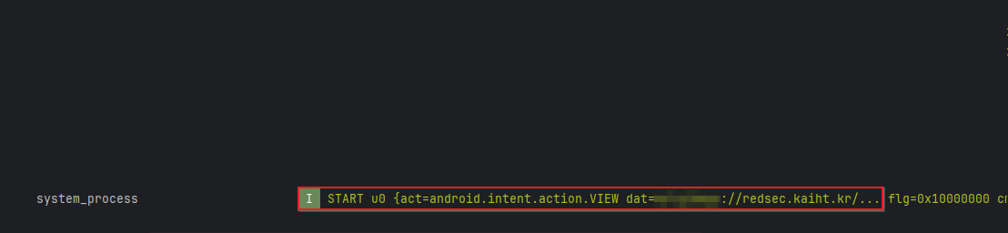 해당 명령을 이용하여 앱이 실행 여부를 이용하여 딥링크 임의 실행 여부를 파악할 수 있으며, 작성한 값 - redsec.kaiht.kr/WebServer/ 으로 앱으로 전달하는 것을 확인할 수 있다.