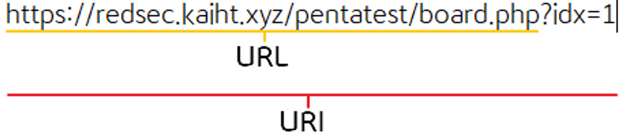 특정 게시글을 나타내는 해당 예시는 이미지 예시와는 다르게 URL 과 URI 가 다른 의미로 사용되는데, URL 은 ~/board.php 까지 이며, 이후 작성되어 백엔드 저장소 내 특정 게시글 식별하기 위한 ?idx=1 (Query String) 까지는 URI 라고 부른다.